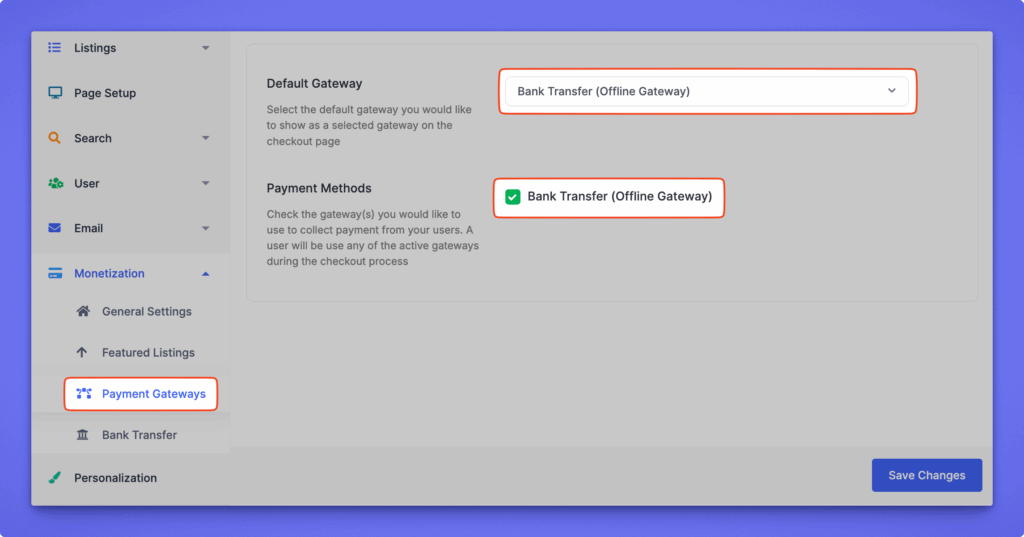 Directorist allows you to manage payment gateways used for collecting payments during checkout. By default, the core plugin supports only Bank Transfer (Offline Gateway).