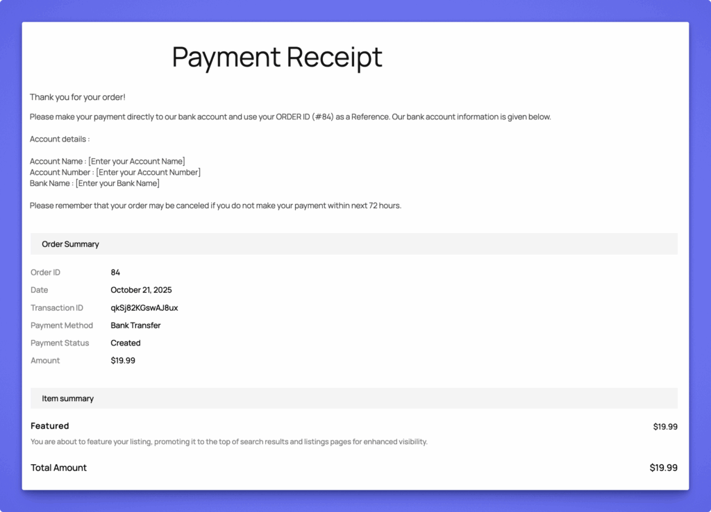 The Bank Transfer gateway allows users to make manual payments directly to your bank account. This method is included in the Directorist core plugin and does not require any additional extension.