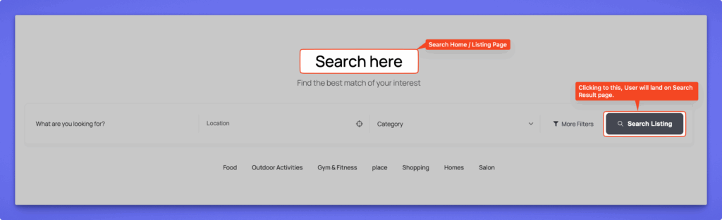 Upon Installation, Directorist will automatically create the Search Results Page. In case of difficulties, or if you need to recreate the Search Result Page, you need to use the shortcode [directorist_search_result] and assign the page in Settings → Page Set Up → Pages, Links and Views → Listing Search Result Page.
