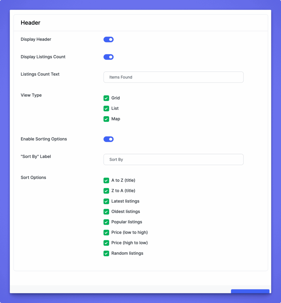 Enable or disable the header section. The header includes the listing count, layout view options, and sorting controls.