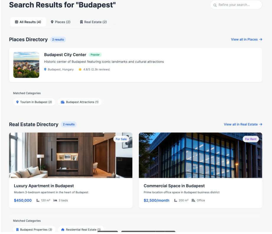 A user types a keyword (e.g., “Budapest”) in the Universal Search form. As they type, dropdown suggestions instantly appear, showing matching listings and categories from different directories