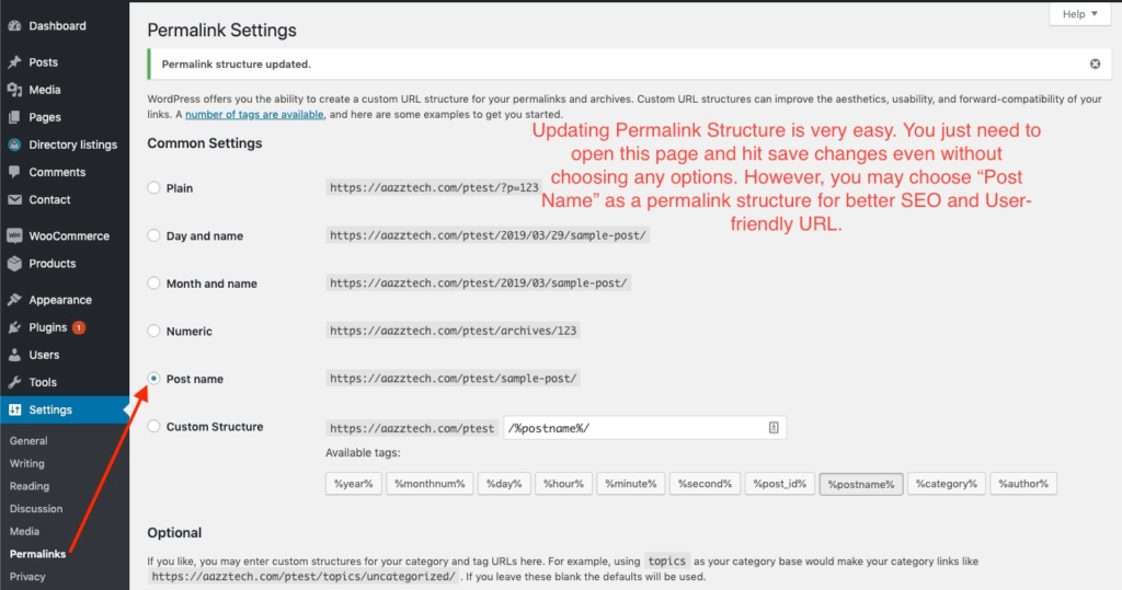 It is important to refresh the permalink settings after installing claim listings add-on. Refreshing permalink is very easy. You just need to go to WordPress Dashboard > Settings > Permalinks and hit the save changes button. You may choose a permalink like Post Name but it is not required. Just opening the page and saving the existing options will do the trick.