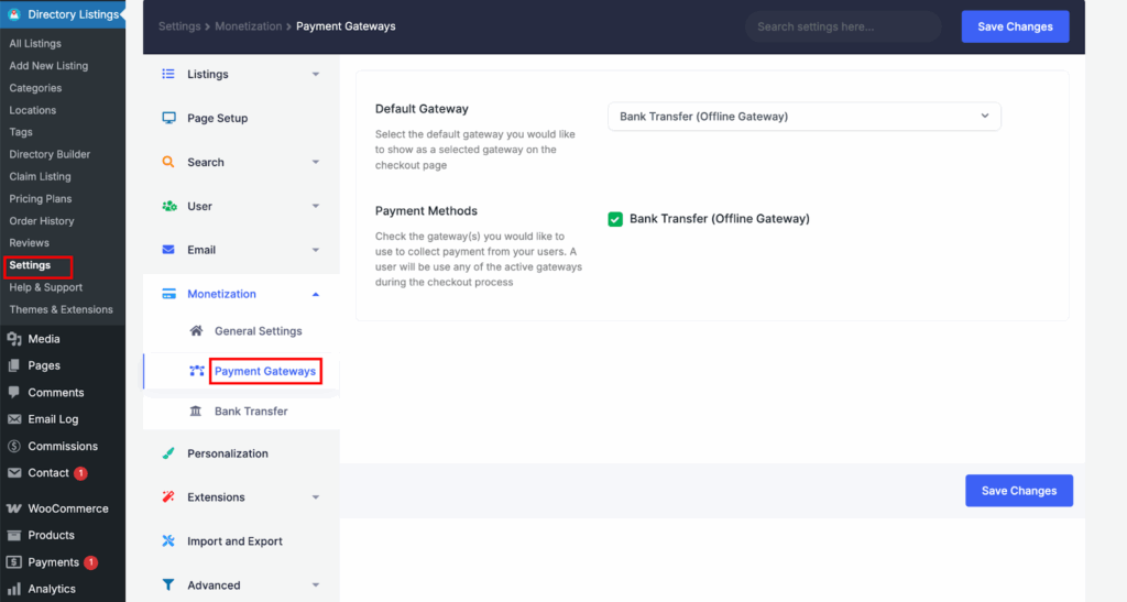 You need to set up at least one gateway to process payments from your user. Directorist Claim listing add-on is compatible with all payment gateways that the Directorist plugin supports. You can process payments using an offline gateway like bank transfer or an online gateway like PayPal* or Stripe*. You can also use multiple payment gateways on your site simultaneously. Go to Directory Settings > Monetization Settings > Gateways Settings and customize the settings according to your need. All settings have detailed descriptions. Please see the screenshot and the description of each gateway settings below. To know the details settings of PayPal and Stripe Gateways, please check out their documentation.