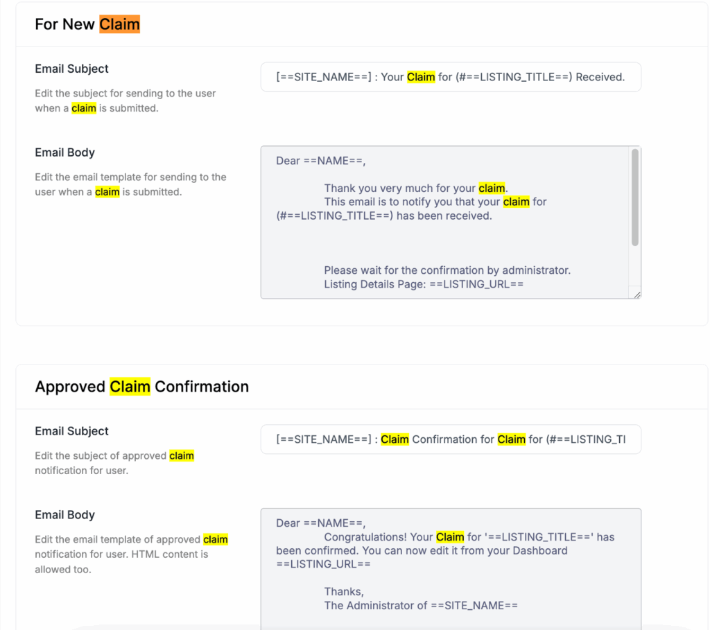 - You can enable/disable sending email notifications to the admin and the claimer when a claim is made, approved or rejected.