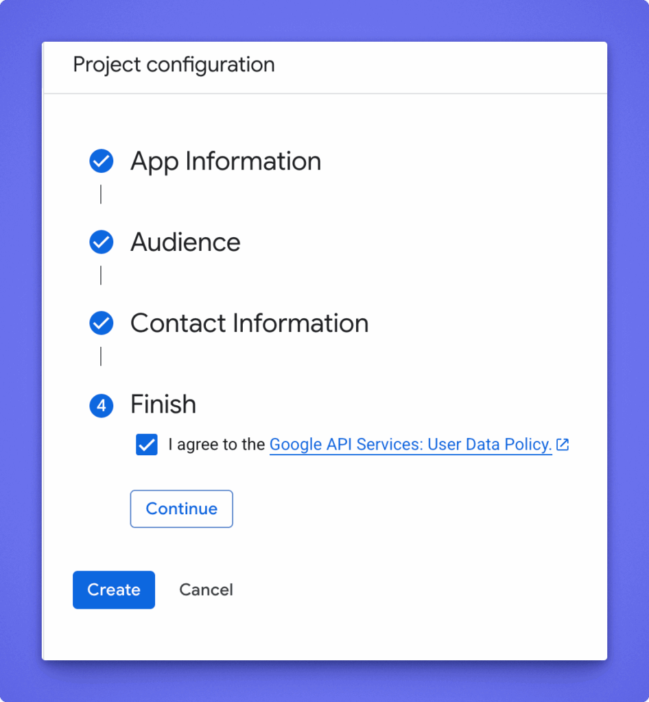 - Add your contact email and agree to the Google policies.