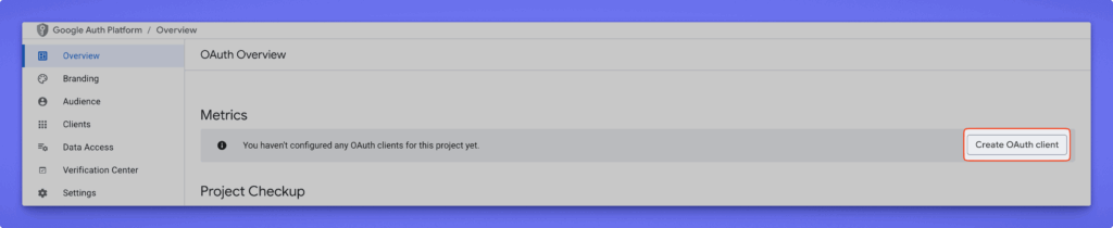 - You will land in Overview section and from here click Create 0Auth Client