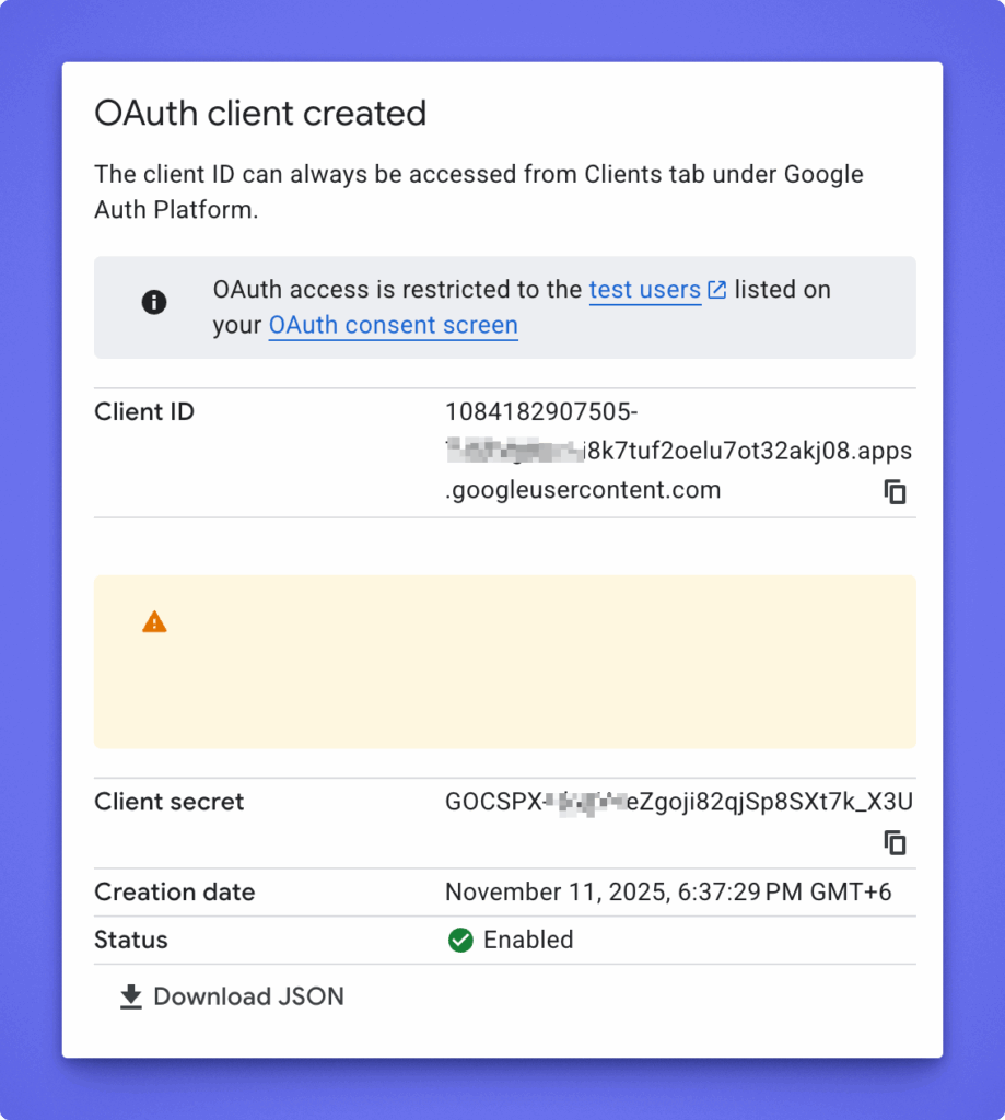 - Copy the generated Client ID and Client Secret. You’ll need them later.