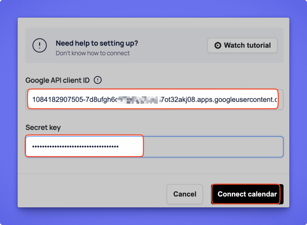 - Enter your Client ID and Client Secret and click Connect Calendar.