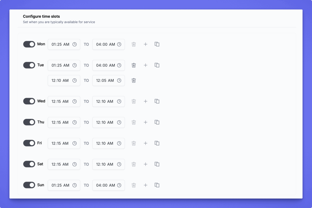 This is where you set your weekly availability. You can configure availability for each day of the week: