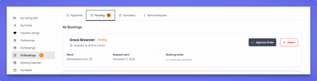 Listing owners can manage every booking request from Dashboard → All Bookings. Bookings are organized into Approved, Pending, Cancelled, and Refund Request tabs, making it easy to navigate.
