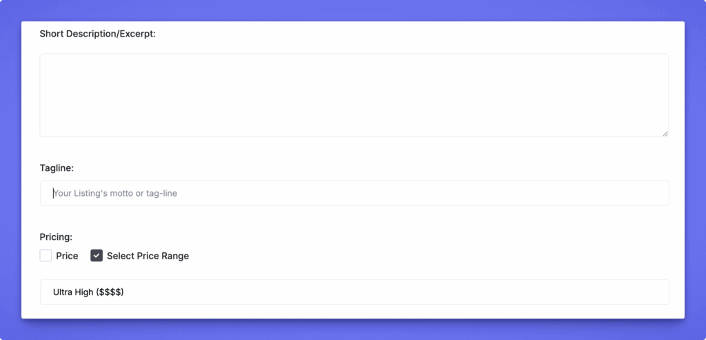 - Tagline – A short motto or catchphrase for the listing.