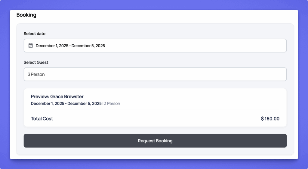 Users can book a rental by selecting their desired date range, choosing the number of guests, and reviewing the booking preview. The system automatically calculates the total cost based on daily prices, weekend rates, and any custom pricing set in the availability calendar.
