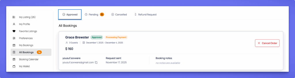 Listing owners can manage every booking request from Dashboard → All Bookings. Bookings are organized into Approved, Pending, Cancelled, and Refund Request tabs, making it easy to navigate.