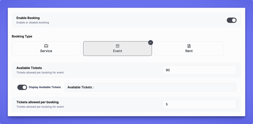 The Event Booking option allows listing owners to sell or reserve tickets for events directly from their directory listings. This setup is ideal for industries like conferences, workshops, classes, community events, and any business that needs to manage ticket availability and booking limits.