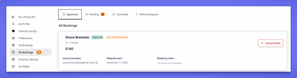 Listing owners can manage every booking request from Dashboard → All Bookings. Bookings are organized into Approved, Pending, Cancelled, and Refund Request tabs, making it easy to navigate.