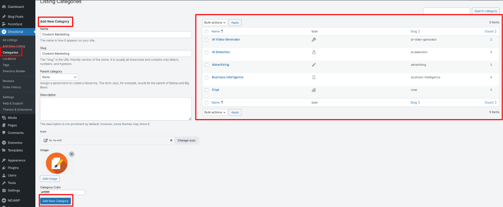 Next, create categories to organize your AI tools and improve navigation. Go to Directorist → Listings → Categories in your WordPress dashboard. You can add as many custom categories as needed.
