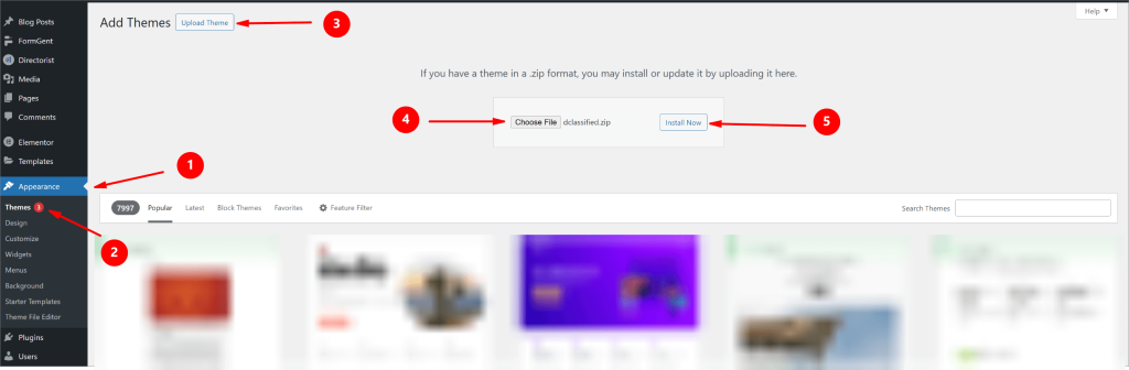 Next, set up the design of your AI tools directory. Go to Appearance → Themes → Add New and upload dClassified. Install and activate the theme to apply a directory-ready layout.
