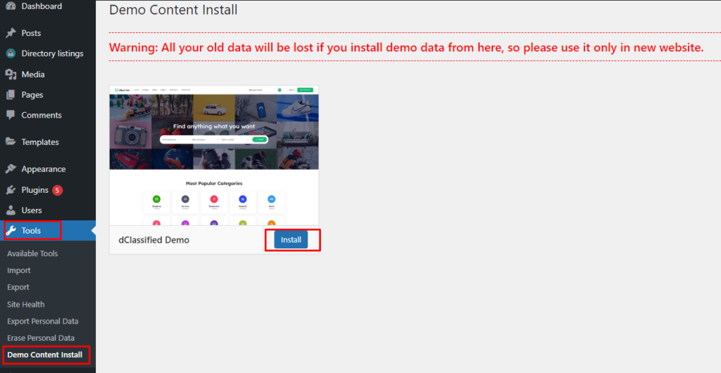 From Admin menu, navigate to Tools -> Demo Content Install. Or alternatively, navigate to Plugins -> WpWax Demo Importer -> Install Demo Contents.
