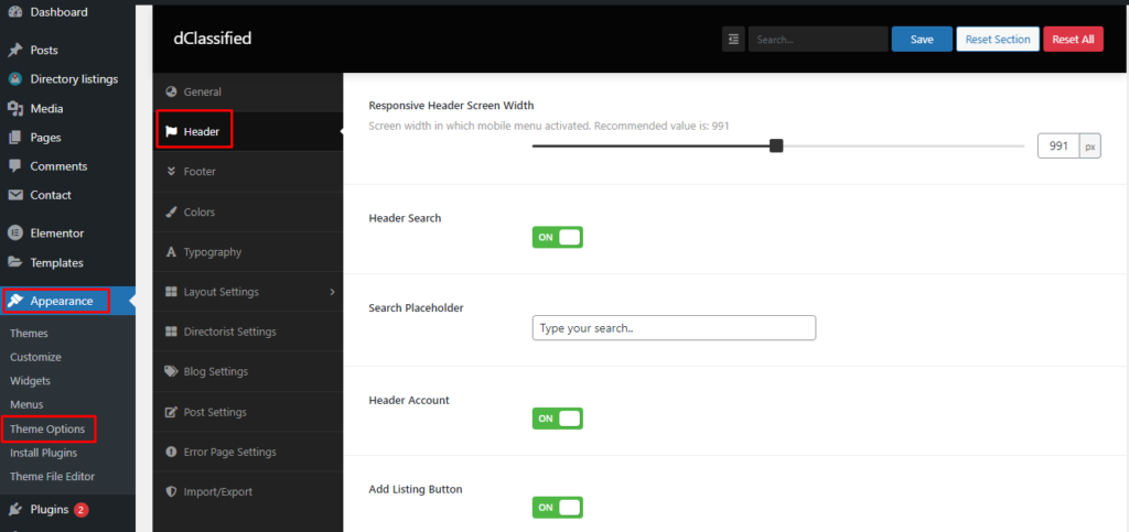 To change the Header related settings, please go to Appearance -> Theme Options. Then go to the Header tab. Following features are available: