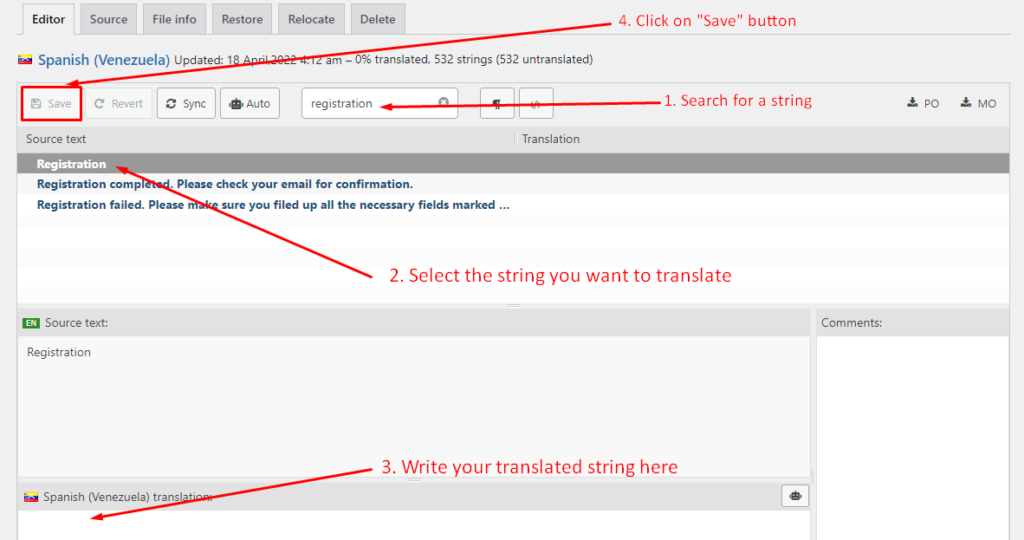 Step 5: Click on the “Sync” button for the first time. Then start translating strings like the image below.