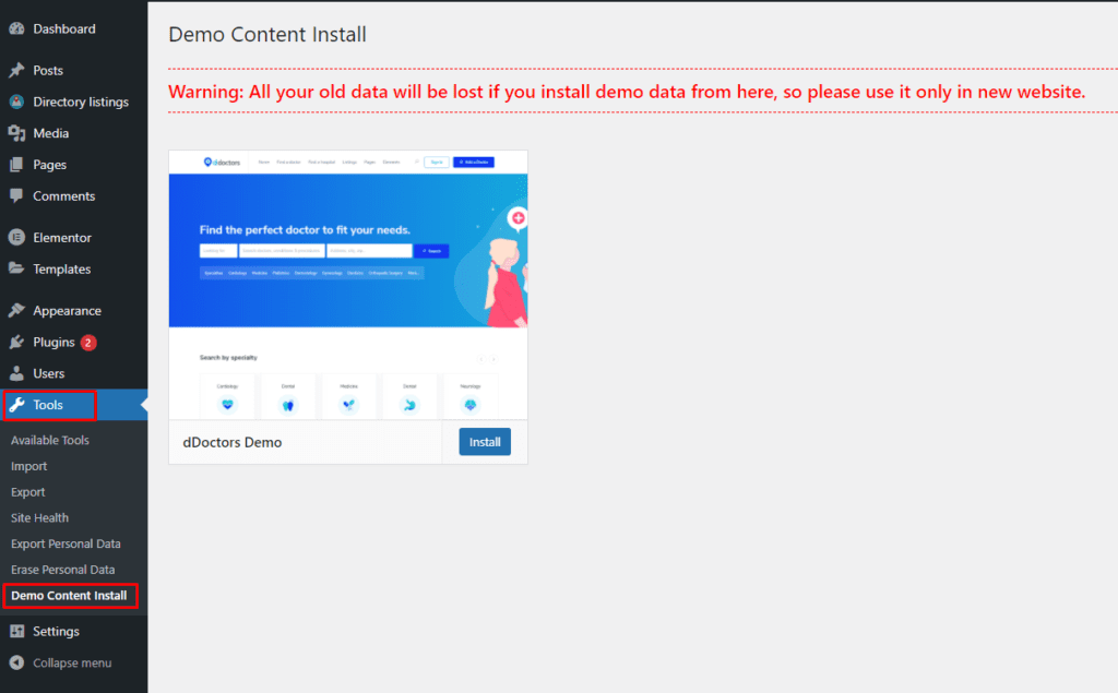 From Admin menu, navigate to Tools -> Demo Content Install. Or alternatively, navigate to Plugins -> WpWax Demo Importer -> Install Demo Contents.