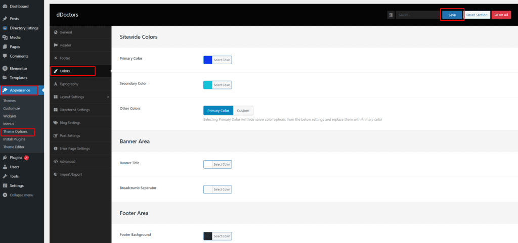 Either select a predefined color scheme or pick your preferred primary color from the color palette. Also from here, you can change colors for various parts of the site.
