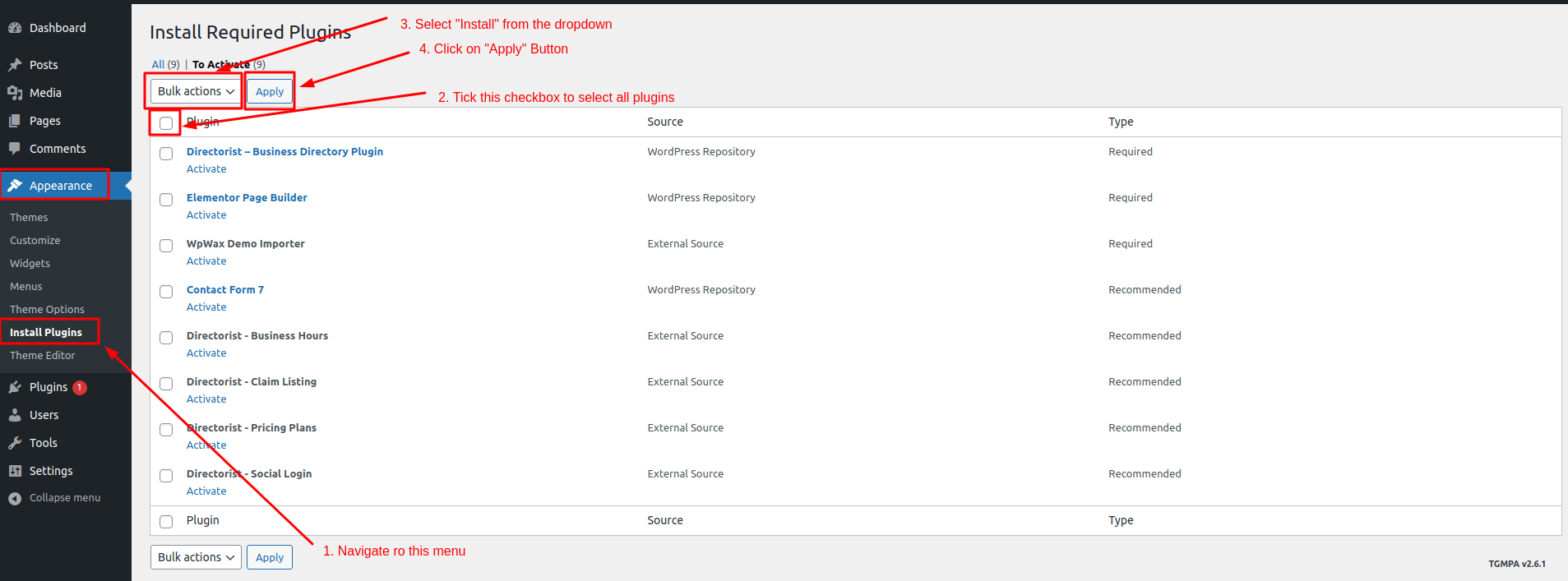 To install these plugins, navigate to Appearance -> Install Plugins and start the installation.