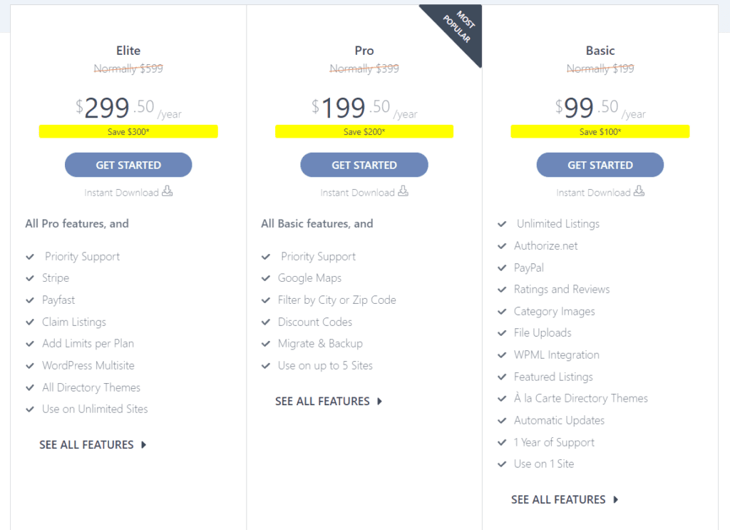 The two rivals have completely different pricing plans. Business Directory Plugin offers only 3 yearly pricing plans: