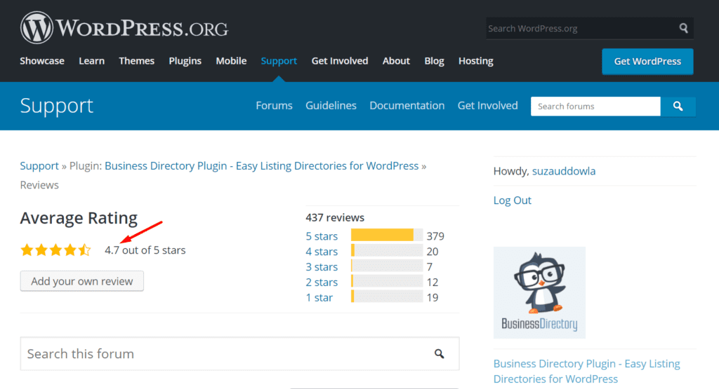 The user rating for Business Directory Plugin is 4.7 out of 5.