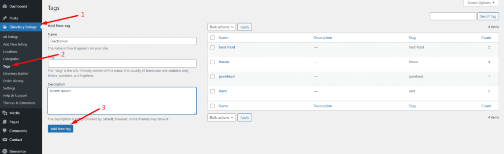 Similarly, you can add tags so that the visitors can find their desired item as fast as possible. You can do it from Directory Listings > Tags > Enter Credentials > Add New Tag.