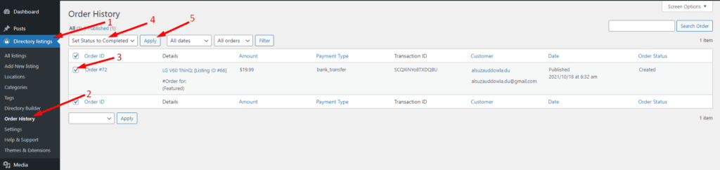 Thus, when a listing owner pays you to make his listing featured, you have to change the status of the order from ‘created‘ to ‘completed‘ so that the listing gets a featured badge. To do it, you must go to the Directory Listings > Order History > Check the box of the order > Select “Set Status to Completed” > Apply.
