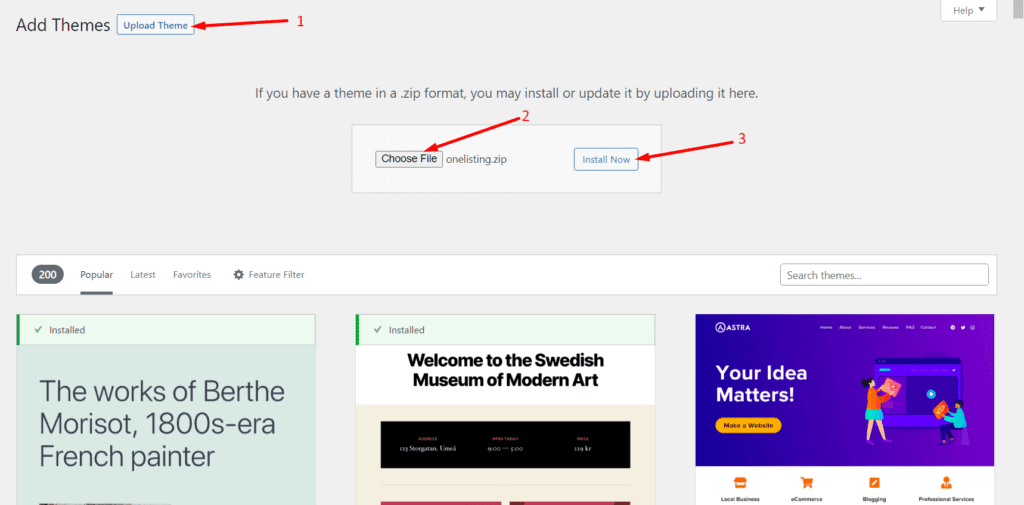 Then click on Upload Theme > Choose File and select the ‘onelisting.zip’ > Install Now.