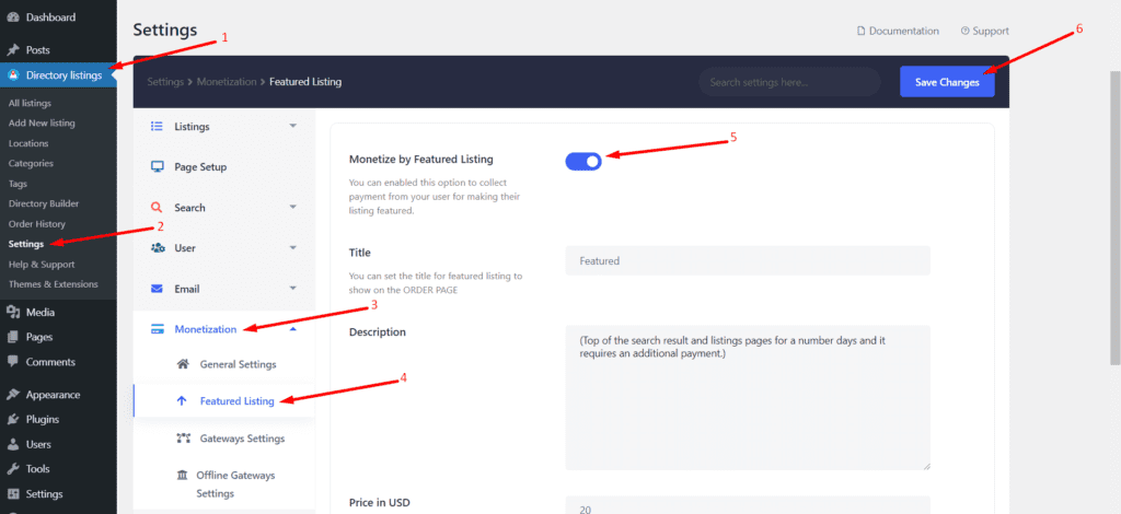 However, if you missed it or to make sure that the feature is turned on, navigate to the WP Admin Dashboard > Directory Listings > Settings > Monetization > Featured Listing > Turn on “Monetization by Featured Listing” > Save Changes.