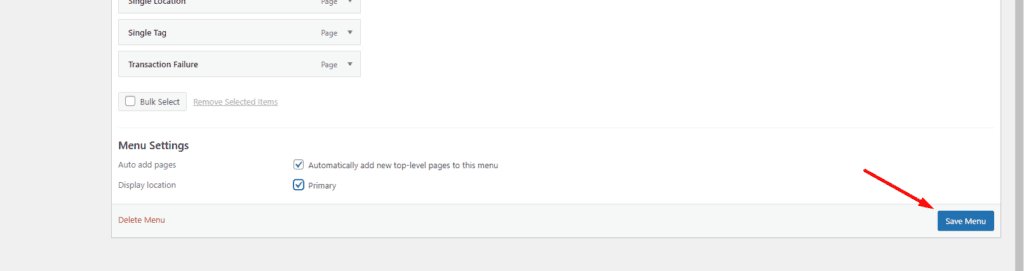 After creating the menu, check the “Auto add pages” and “Display location” boxes and then hit the Save Menu.