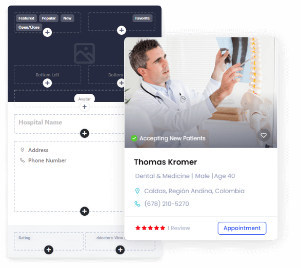 One of the most feature-rich components of the dDoctors theme is its user-friendliness. You can design and craft each listing card as your wish. There are options to make an individual listing card more personalized.
