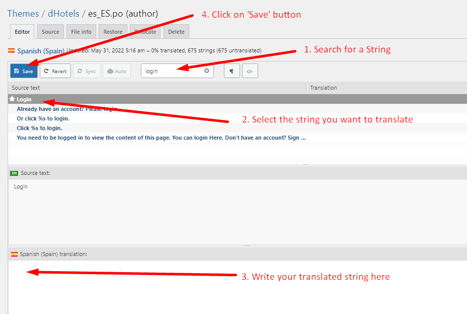 Step 5: Click on the “Sync” button for the first time. Then start translating strings like the image below.