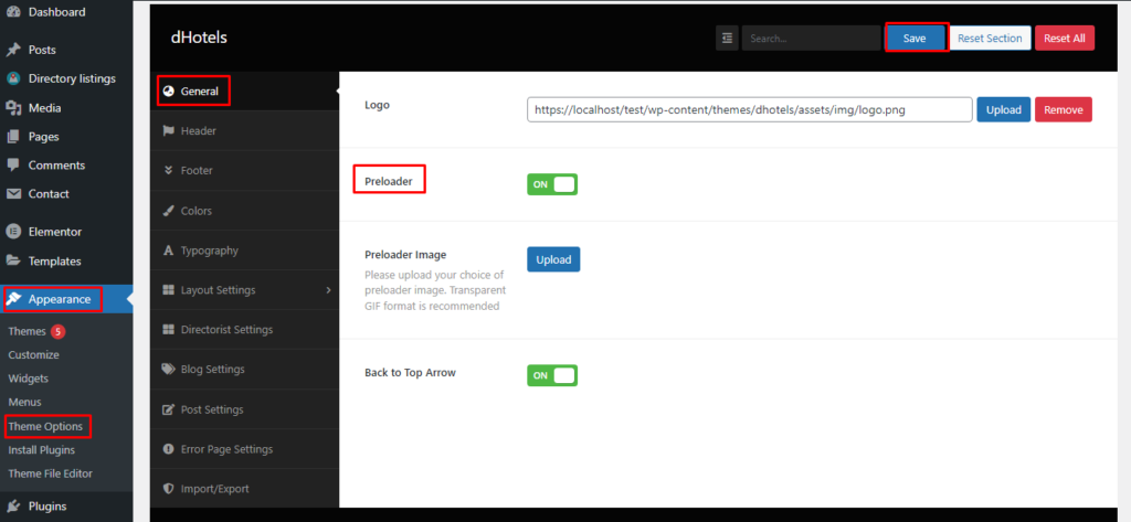 Here you can find the option for enabling/disabling the “Preloader” option. Also, you can upload your custom preloader image. When uploading an image please make sure it’s a transparent GIF image.