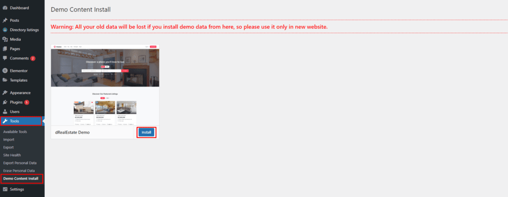 From Admin menu, navigate to Tools -> Demo Content Install. Or alternatively, navigate to Plugins -> WpWax Demo Importer -> Install Demo Contents.