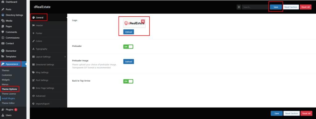 Here you can find the option for enabling/disabling the “Preloader” option. Also, you can upload your custom preloader image. When uploading an image please make sure it’s a transparent GIF image.