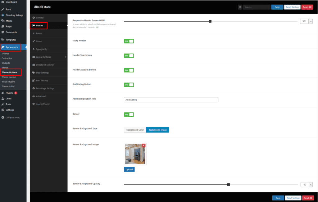 To change the Header related settings, please go to Appearance -> Theme Options. Then go to the Header tab. Following features are available: