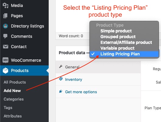 Select Listing Pricing Plan Product TypeAdd new plan using WooCommerce (Click on the image to see the full size)