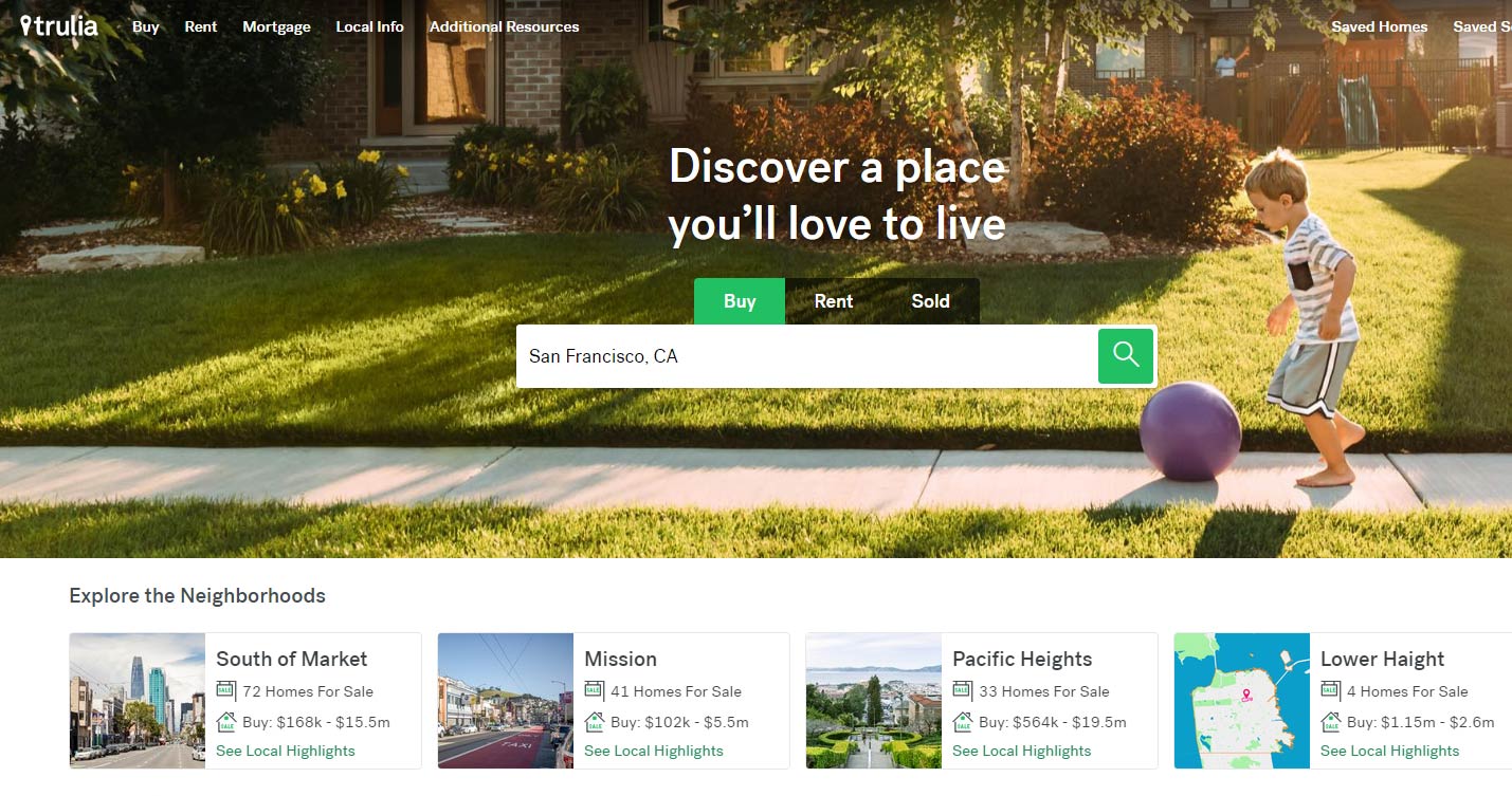 Trulia, a subsidiary of Zillow, provides an attractive interface and neighborhood-centric approach. It provides detailed insights into demographics, schools, crime rates, and amenities. Trulia also offers a “heat map” feature. And it highlights areas with hot or cold markets of properties.